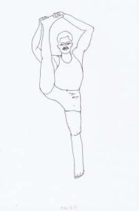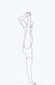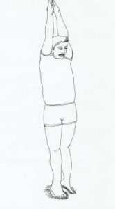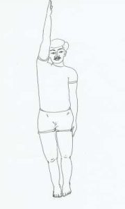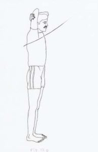 - Stretch the left arm over the left ear. Ensure to keep head up and focus the eyes towards the finger tips