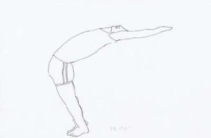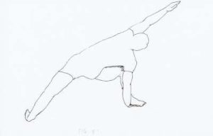 - Exhale slowly and simultaneously lower the right hand palm in order to place the palm on the ground and raise the left hand upward, and see the tips of the left-hand fingers.