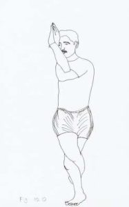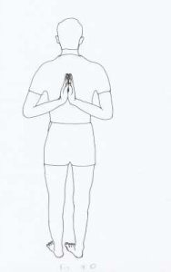 1. Stand firmly and keep both the feet together. The knees should be straight and keep the hands tight and firm. Concentrate on a particular object and keep the mind calm and relaxed. (refer Fig. below).